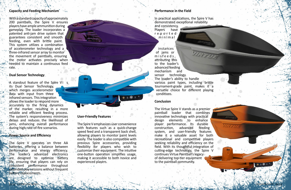 The Virtue Spire V stands as a premier paintball loader that combines innovative technology with practical design elements to enhance player performance . Its durable construction , advanced feeding system , and user-friendly features make it a valuable asset for both recreational and competitive players seeking reliability and efficiency on the field . With its thoughtful integration of cutting-edge technology , the Spire V continues Virtue Paintball ’ s legacy of delivering top-tier equipment to the paintball community . www . paintball . media