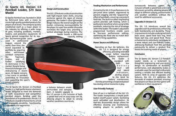 The GI Sportz LVL Version 1.5 Paintball Loader is a high-performance electronic loader designed to meet the demands of both recreational and competitive paintball players . Building upon the foundation of its predecessor , the LVL 1.5 introduces several enhancements aimed at improving durability , functionality , and overall user experience .
