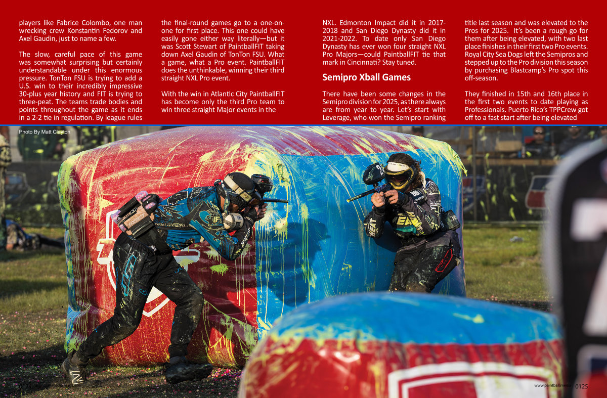 The slow, careful pace of this game was somewhat surprising but certainly understandable under this enormous pressure. TonTon FSU is trying to add a U. S. win to their incredibly impressive 30-plus year history and FIT is trying to three-peat. The teams trade bodies and points throughout the game as it ends in a 2-2 tie in regulation. By league rules the final-round games go to a one-onone for first place. This one could have easily gone either way literally— but it was Scott Stewart of PaintballFIT taking down Axel Gaudin of TonTon FSU. What a game, what a Pro event. PaintballFIT does the unthinkable, winning their third straight NXL Pro event.