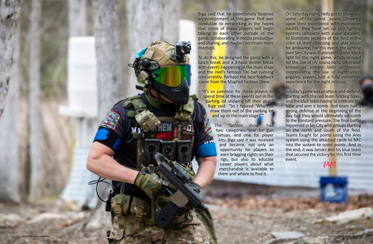 On Saturday night, Hells got to showcase some of its latest assets. Drawing upon their experience with Halloween haunts, they have set up LED lighting systems complete with audio speakers, to illuminate sections of the field in the color of their choosing and play music for ambiance. For this event, the lighting over Sin City was illuminated under black light for the night game, which allowed for the use of UV round balls, otherwise known as zombie balls or tracers. Incorporating the use of night vision goggles, players had a fully immersive experience for the night mission.
