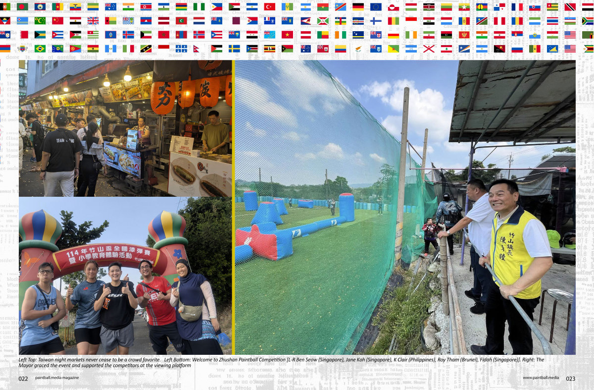 Left Top: Taiwan night markets never cease to be a crowd favorite. Left Bottom: Welcome to Zhushan Paintball Competition [ L-R B Mayor graced the event and supported the competitors at the viewing platform