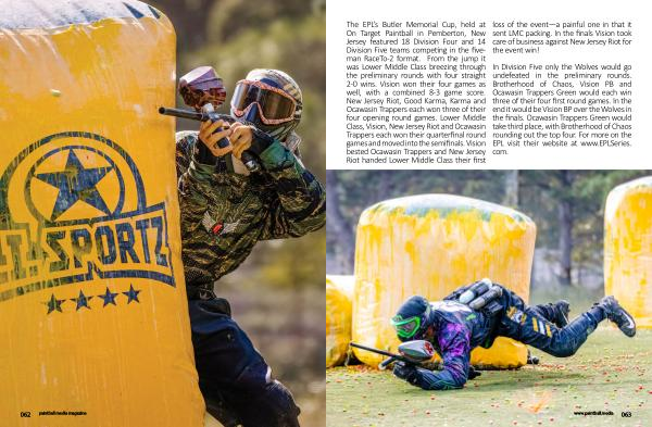 The EPL ’ s Butler Memorial Cup , held at On Target Paintball in Pemberton , New Jersey featured 18 Division Four and 14 Division Five teams competing in the fiveman RaceTo-2 format . From the jump it was Lower Middle Class breezing through the preliminary rounds with four straight 2-0 wins . Vision won their four games as well , with a combined 8-3 game score . New Jersey Riot , Good Karma , Karma and Ocawasin Trappers each won three of their four opening round games . Lower Middle Class , Vision , New Jersey Riot and Ocawasin Trappers each won their quarterfinal round games and moved into the semifinals . Vision bested Ocawasin Trappers and New Jersey Riot handed Lower Middle Class their first loss of the event — a painful one in that it sent LMC packing . In the finals Vision took care of business against New Jersey Riot for the event win !