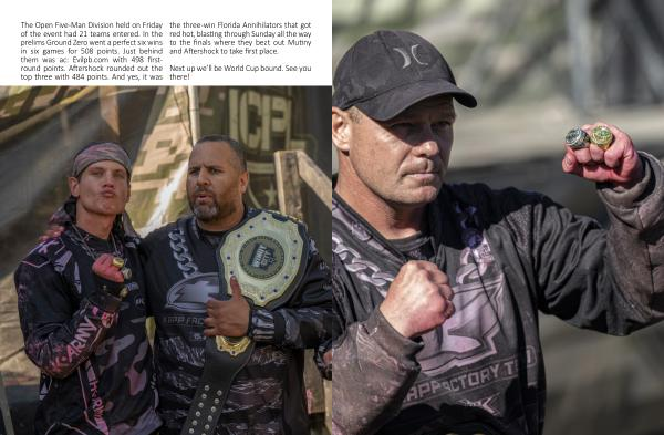 The Open Five-Man Division held on Friday of the event had 21 teams entered . In the prelims Ground Zero went a perfect six wins in six games for 508 points . Just behind them was ac : Evilpb . com with 498 firstround points . Aftershock rounded out the top three with 484 points . And yes , it was the three-win Florida Annihilators that got red hot , blasting through Sunday all the way to the finals where they beat out Mutiny and Aftershock to take first place .