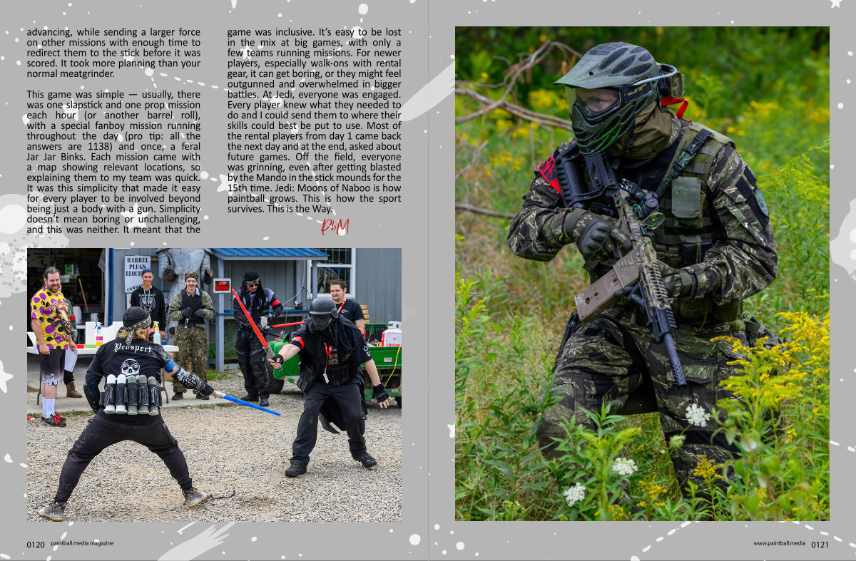 game was inclusive. It’ s easy to be lost in the mix at big games, with only a few teams running missions. For newer players, especially walk-ons with rental gear, it can get boring, or they might feel outgunned and overwhelmed in bigger battles. At Jedi, everyone was engaged. Every player knew what they needed to do and I could send them to where their skills could best be put to use. Most of the rental players from day 1 came back the next day and at the end, asked about future games. Off the field, everyone was grinning, even after getting blasted by the Mando in the stick mounds for the 15th time. Jedi: Moons of Naboo is how paintball grows. This is how the sport survives. This is the Way.