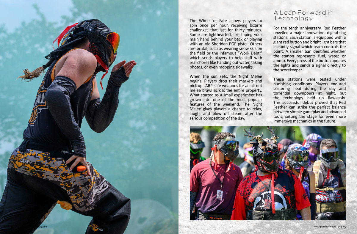 For the tenth anniversary, Red Feather unveiled a major innovation: digital flag stations. Each station is equipped with a giant red button and bright light bars that instantly signal which team controls the point. A smaller bar identifies whether the station represents fuel, water, or ammo. Every press of the button updates the lights and sends a signal directly to the scorekeeper.