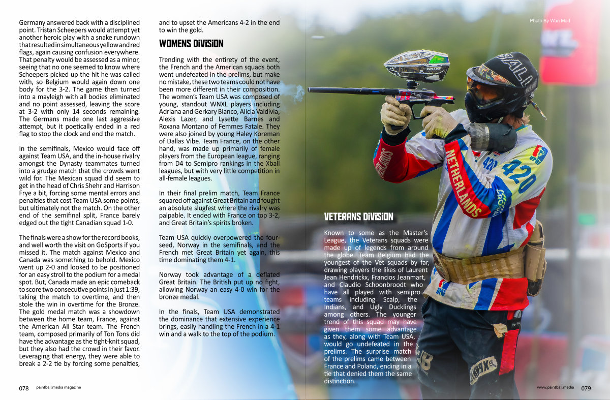 Known to some as the Master’ s League, the Veterans squads were made up of legends from around the globe. Team Belgium had the youngest of the Vet squads by far, drawing players the likes of Laurent Jean Hendrickx, Francios Jeanmart, and Claudio Schoonbroodt who have all played with semipro teams including Scalp, the Indians, and Ugly Ducklings among others. The younger trend of this squad may have given them some advantage as they, along with Team USA, would go undefeated in the prelims. The surprise match of the prelims came between France and Poland, ending in a tie that denied them the same distinction. www. paintball. media