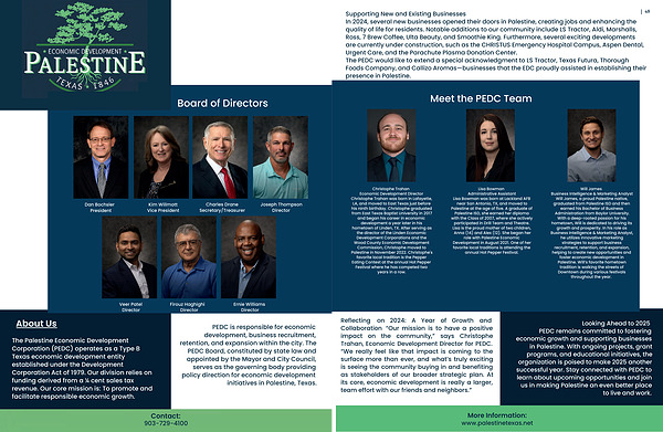 Looking Ahead to 2025 PEDC remains committed to fostering economic growth and supporting businesses in Palestine . With ongoing projects , grant programs , and educational initiatives , the organization is poised to make 2025 another successful year . Stay connected with PEDC to learn about upcoming opportunities and join us in making Palestine an even better place to live and work .