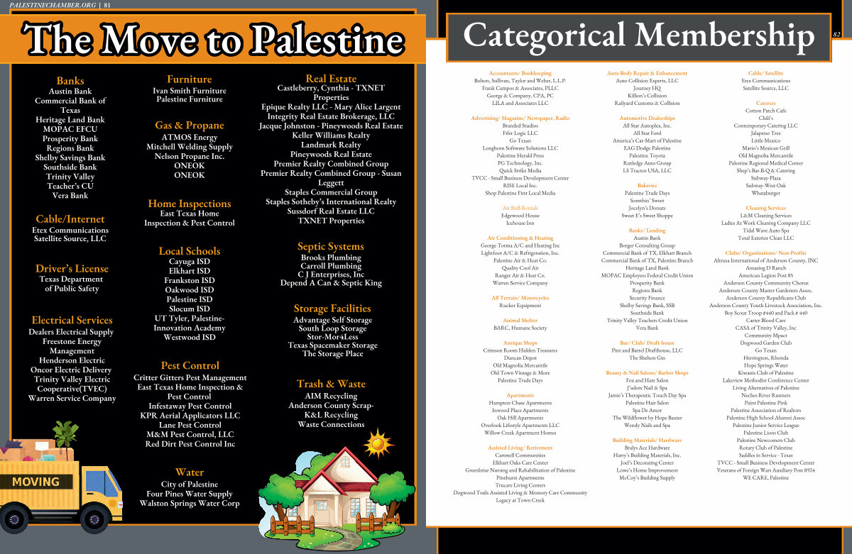 Banks / Lending Austin Bank Borger Consulting Group Commercial Bank of TX , Elkhart Branch Commercial Bank of TX , Palestine Branch Heritage Land Bank MOPAC Employees Federal Credit Union Prosperity Bank Regions Bank Security Finance Shelby Savings Bank , SSB Southside Bank Trinity Valley Teachers Credit Union Vera Bank