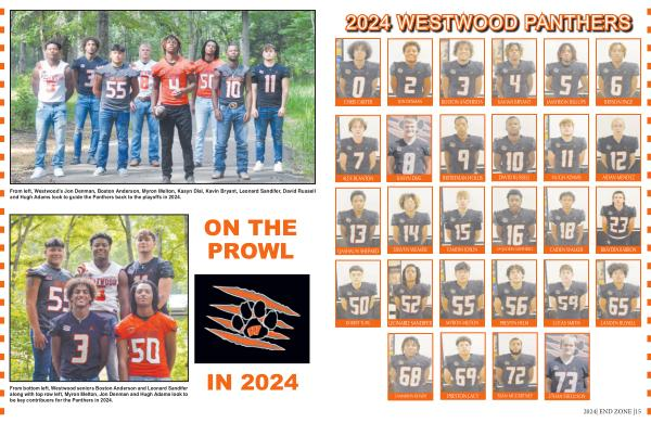 2024 | END ZONE | 15 2024 WESTWOOD PANTHERS 2024 WESTWOOD PANTHERS CHRIS CARTER ALEX BLANTON DELVYN WEAVER LEONARD SANDIFER JON DENMAN CAMDIN JOSLIN MYRON MELTON BOSTON ANDERSON DAVID RUSSELL ZAQUOREN SHEPHERD PRESTYN HELM KAVIAN BRYANT HUGH ADAMS CAIDEN WALKER LUCAS SMITH JAMYRION BILLUPS AIDAN MENDEZ BRAYDEN BARRON LANDEN RUSSELL BRYSON PAGE QASHAUN SHEPARD CAMARION BEAVER ROBERT TUPIL PRESTON LACY SEAN MCCARTNEY BRITREVIAN HOLLIS ETHAN FERGUSON KASYN DIAL