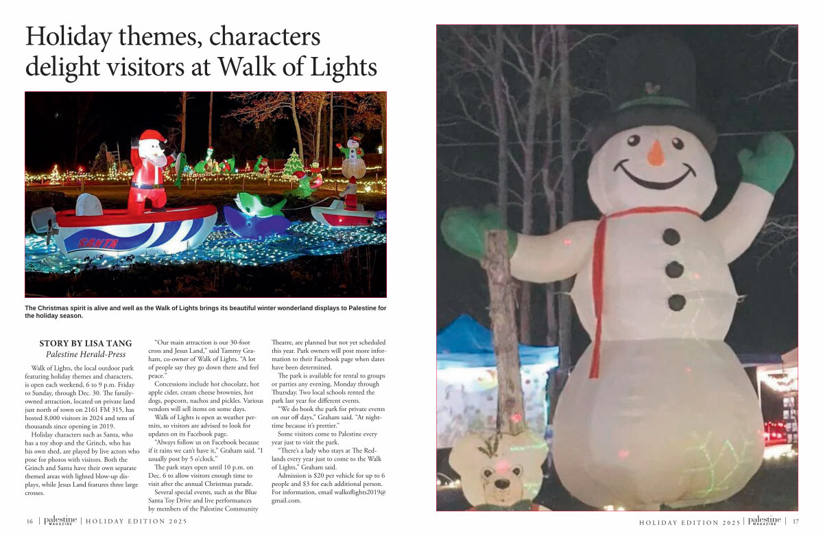 Walk of Lights, the local outdoor park featuring holiday themes and characters, is open each weekend, 6 to 9 p. m. Friday to Sunday, through Dec. 30. The familyowned attraction, located on private land just north of town on 2161 FM 315, has hosted 8,000 visitors in 2024 and tens of thousands since opening in 2019.