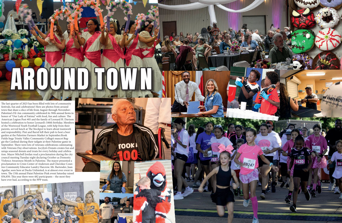 The last quarter of 2025 has been filled with lots of community festivals, fun and celebrations! Here are photos from around town that share a slice of life from August through November: Palestine’ s Fil-Am community celebrated its 30th annual fiesta in honor of“ Our Lady of Fatima” with food, fun and culture. The American Legion Post # 85 and the family of Leonard H. Davison hosted a celebration to honor Leonard’ s 100th birthday. Members of the Westwood Youth Football League, with help from their parents, served lunch at The Stockpot to learn about teamwork and responsibility. Pint and Barrel left their pub to host a beer garden at the Palestine Farmers Market in September. Rook Fields hugs Trinity Valley Community College’ s mascot Reggie the Cardinal during their tailgate at their Palestine game in September. There were lots of veterans celebrations culminating with Veterans Day observations. Jocylyn’ s Donuts creates fun and uniqu seasonal donuts and treats for every holiday and celebration. Mayor Mitchell Jordan read a proclamation during the city council meeting Tuesday night declaring October as Domestic Violence Awareness Month in Palestine. The mayor presented a proclamation to Crisis Center of Anderson and Cherokee Counties Community Educator Landry Harcrow. Mr. Bartender, Juan Aguilar, seen here at Ducks Unlimited, is at almost ever event in town. The 15th annual Paint Palestine Pink event Saturday raised $ 56,850. This year there were 482 participants – the most they have ever had, according to the PPP team.