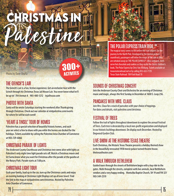 Join Mrs . Claus for a stack of pancakes with your choice of toppings . For dates and details , visit palestine . com / christmas