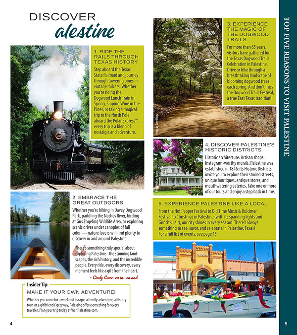 Whether you come for a weekend escape, a family adventure, a history tour, or a girlfriends’ getaway, Palestine offers something for every traveler. Plan your trip today at VisitPalestine. com.