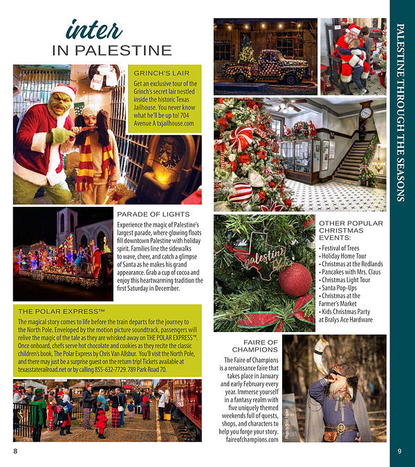The magical story comes to life before the train departs for the journey to the North Pole. Enveloped by the motion picture soundtrack, passengers will relive the magic of the tale as they are whisked away on THE POLAR EXPRESS™. Once onboard, chefs serve hot chocolate and cookies as they recite the classic children’ s book, The Polar Express by Chris Van Allsbur. You’ ll visit the North Pole, and there may just be a surprise guest on the return trip! Tickets available at texasstaterailroad. net or by calling 855-632-7729. 789 Park Road 70.