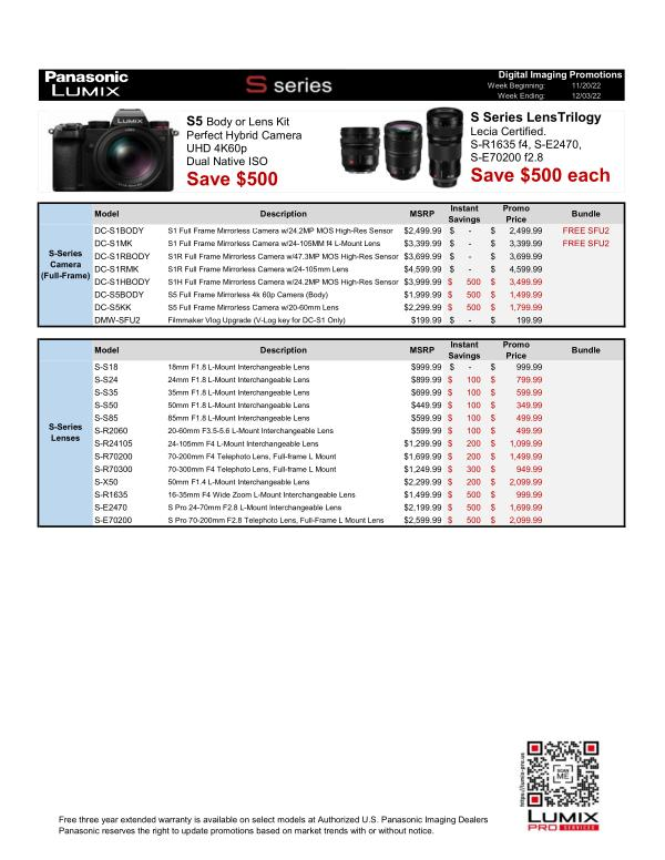 Savings Price DC-S1BODY S1 Full Frame Mirrorless Camera w / 24.2MP MOS High-Res Sensor $ 2,499.99 $ - $ 2,499.99 FREE SFU2 DC-S1MK S1 Full Frame Mirrorless Camera w / 24-105MM f4 L-Mount Lens $ 3,399.99 $ - $ 3,399.99 FREE SFU2 DC-S1RBODY S1R Full Frame Mirrorless Camera w / 47.3MP MOS High-Res Sensor $ 3,699.99 $ - $ 3,699.99 DC-S1RMK S1R Full Frame Mirrorless Camera w / 24-105mm Lens $ 4,599.99 $ - $ 4,599.99 DC-S1HBODY S1H Full Frame Mirrorless Camera w / 24.2MP MOS High-Res Sensor $ 3,999.99 $ 500 $ 3,499.99 DC-S5BODY S5 Full Frame Mirrorless 4k 60p Camera ( Body ) $ 1,999.99 $ 500 $ 1,499.99 DC-S5KK S5 Full Frame Mirrorless Camera w / 20-60mm Lens $ 2,299.99 $ 500 $ 1,799.99 DMW-SFU2 Filmmaker Vlog Upgrade ( V-Log key for DC-S1 Only ) $ 199.99 $ - $ 199.99