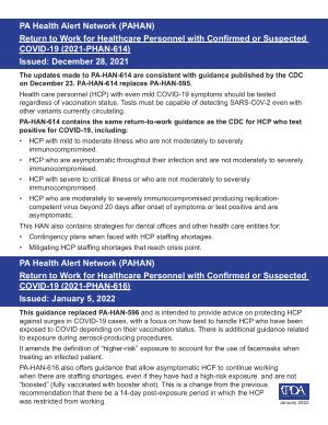 PA-HAN-616 also offers guidance that allow asymptomatic HCP to continue working when there are staffing shortages , even if they have had a high-risk exposure and are not “ boosted ” ( fully vaccinated with booster shot ). This is a change from the previous recommendation that there be a 14-day post-exposure period in which the HCP was restricted from working .