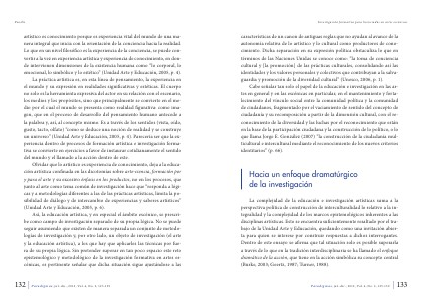Así, la educación artística, y en especial el ámbito escénico, se prescribe como campo de investigación separado de su propia lógica. No se puede seguir asumiendo que existen de manera separada un conjunto de metodologías de investigación y, por otro lado, un objeto de investigación( el arte y la educación artística), a los que hay que aplicarles las técnicas por fuera de su propia lógica. Sin pretender superar en tan poco espacio este reto epistemológico y metodológico de la investigación formativa en artes escénicas, es pertinente señalar que dicha situación sigue ajustándose a las