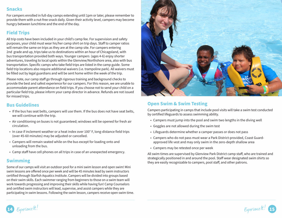All swim times are supervised by Glenview Park District camp staff, who are trained and strategically positioned in and around the pool. Staff wear designated swim shirts so they are easily recognizable to campers, pool staff, and other patrons.