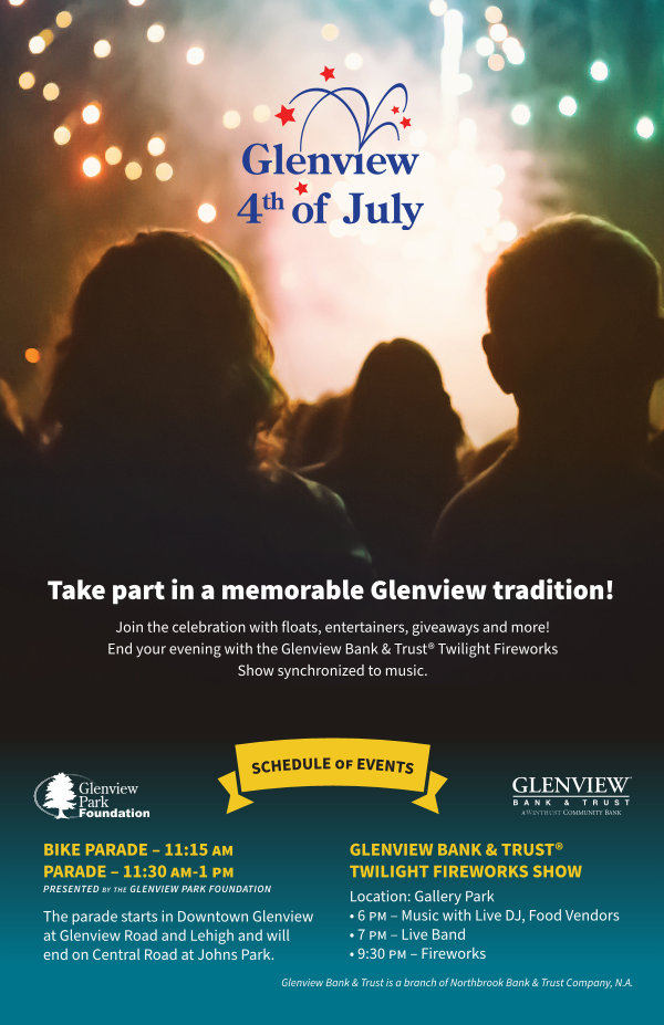Join the celebration with floats, entertainers, giveaways and more! End your evening with the Glenview Bank & Trust ® Twilight Fireworks Show synchronized to music.