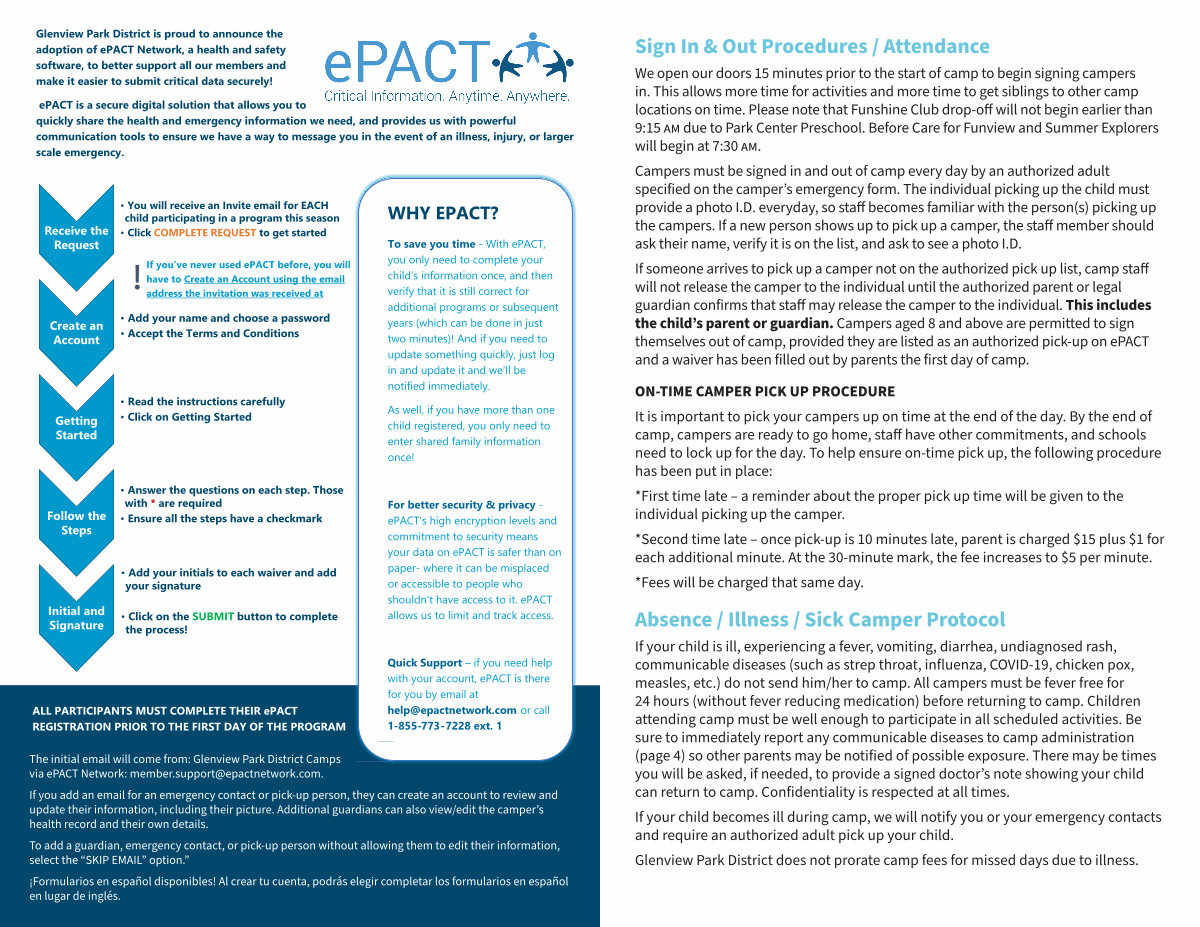 ALL PARTICIPANTS MUST COMPLETE THEIR ePACT ALL REGISTRATION PARTICIPANTS PRIOR MUST TO THE COMPLETE FIRST DAY THEIR OF EPACT ePACT THE PROGRAM REGISTRATION PRIOR TO THE FIRST DAY OF THE PROGRAM The initial email will come from: Glenview Park District Camps via ePACT Network: member. support @ epactnetwork. com.