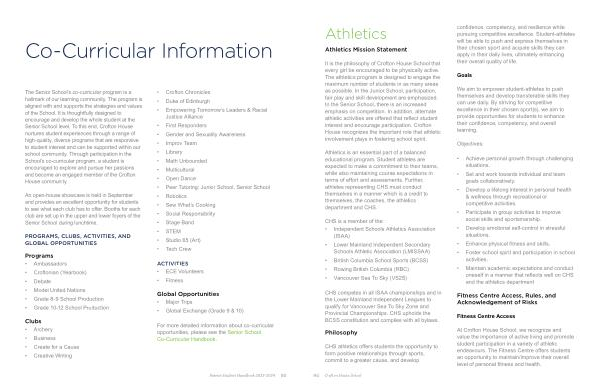It is the philosophy of Crofton House School that every girl be encouraged to be physically active . The athletics program is designed to engage the maximum number of students in as many areas as possible . In the Junior School , participation , fair play and skill development are emphasized . In the Senior School , there is an increased emphasis on competition . In addition , alternate athletic activities are offered that reflect student interest and encourage participation . Crofton House recognizes the important role that athletic involvement plays in fostering school spirit .