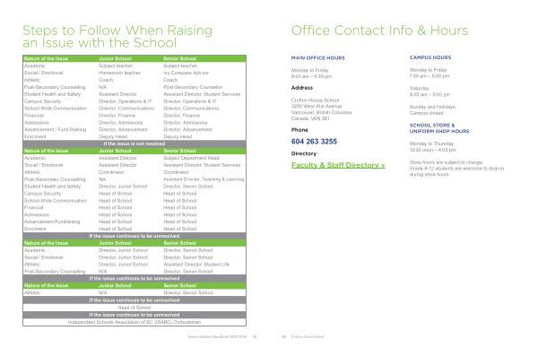If the issue continues to be unresolved Nature of the Issue Junior School Senior School Academic Director , Junior School Director , Senior School Social / Emotional Director , Junior School Director , Senior School Athletic Director , Junior School Assistant Director , Student Life Post-Secondary Counselling N / A Director , Senior School