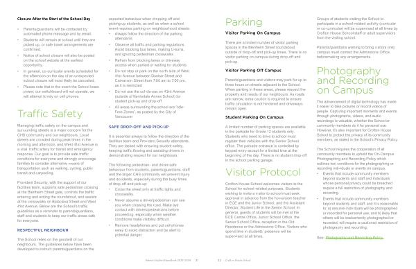 There are a limited number of visitor parking spaces in the Blenheim Street roundabout outside of drop-off and pick-up times . There is no visitor parking on campus during drop-off and pick-up .