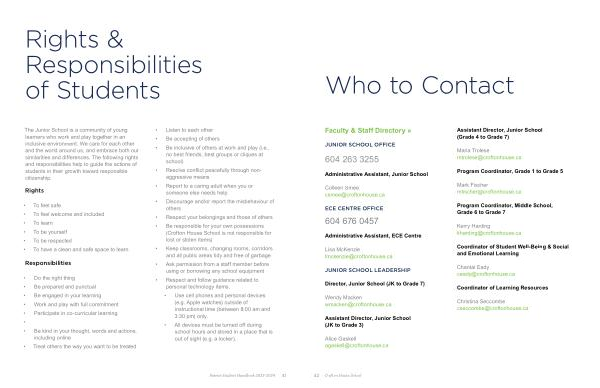 The Junior School is a community of young learners who work and play together in an inclusive environment . We care for each other and the world around us , and embrace both our similarities and differences . The following rights and responsibilities help to guide the actions of students in their growth toward responsible citizenship .