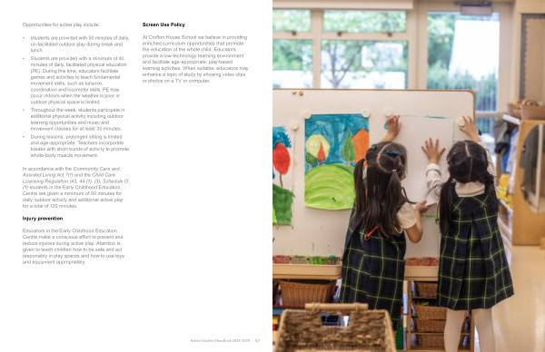 In accordance with the Community Care and Assisted Living Act 7 ( 1 ) and the Child Care Licensing Regulation ( 43 , 44 ( 1 ), ( 3 ), Schedule G ( 1 ) students in the Early Childhood Education Centre are given a minimum of 60 minutes for daily outdoor activity and additional active play for a total of 120 minutes .