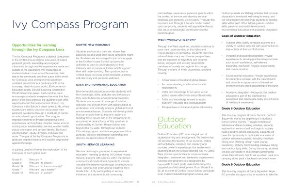The Ivy Compass Program is a distinct component in the Crofton House School education . It fosters personal growth , leadership and engaged citizenship through real-life experiences inside and outside of the classroom . We encourage all students to learn more about themselves , their role in the community and their place in the world . Ivy Compass uses an experiential approach centered around the four cardinal points of the compass : New Horizons ( north ), Environmental Education ( east ), Service Learning ( south ) and World Citizenship ( west ). Each cardinal point encourages students to explore the roles that they play in their lives and how the quadrants can offer ways to deepen their experiences of each . Ivy Compass is the School ’ s vision come to life , where students are able to discover and pursue their personal excellence through a multitude of handson educational opportunities . The program exposes students to diverse perspectives and experiences , and explores complex issues around social justice , sustainability , service , mental health , sexual orientation and gender identity , Truth and Reconciliation , equity , diversity , inclusion and more . The goal of the Ivy Compass Program is to graduate inspired leaders and socially responsible agents of change .