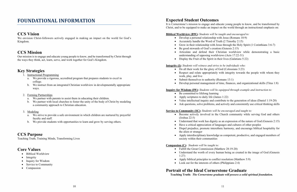 It is Cornerstone’ s mission to engage and educate young people to know, and be transformed by Christ, and to be equipped to make an impact on the world through an instructional emphasis on: