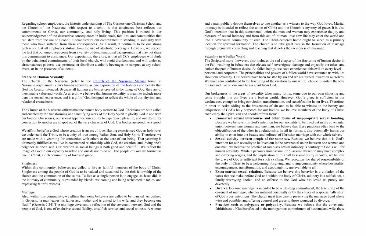 • Sexual activity between people of the same sex. Because we believe that it is God’ s intention for our sexuality to be lived out in the covenantal union between one woman and one man, we believe the practice of same-sex sexual intimacy is contrary to God’ s will for human sexuality. While a person’ s homosexual or bi-sexual attraction may have complex and differing origins, and the implication of this call to sexual purity is costly, we believe the grace of God is sufficient for such a calling. We recognize the shared responsibility of the body of Christ to be a welcoming, forgiving, and loving community where hospitality, encouragement, transformation, and accountability are available to all.