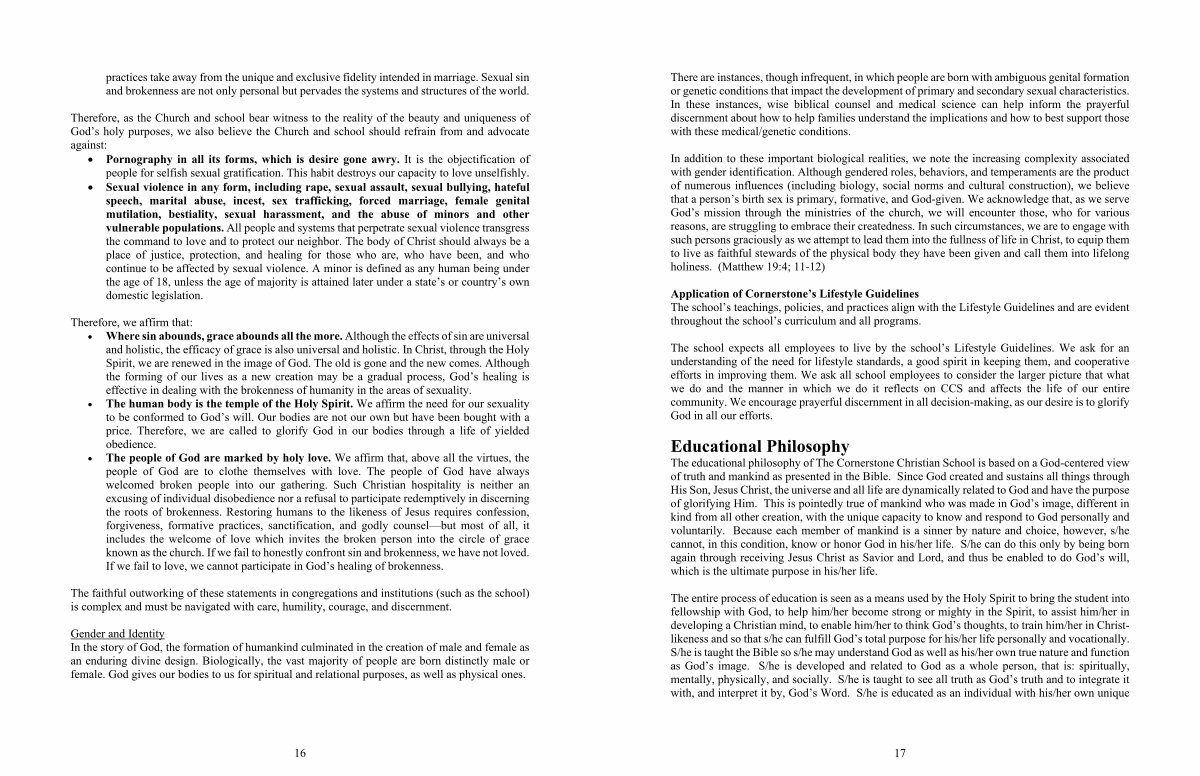 Therefore, as the Church and school bear witness to the reality of the beauty and uniqueness of God’ s holy purposes, we also believe the Church and school should refrain from and advocate against: