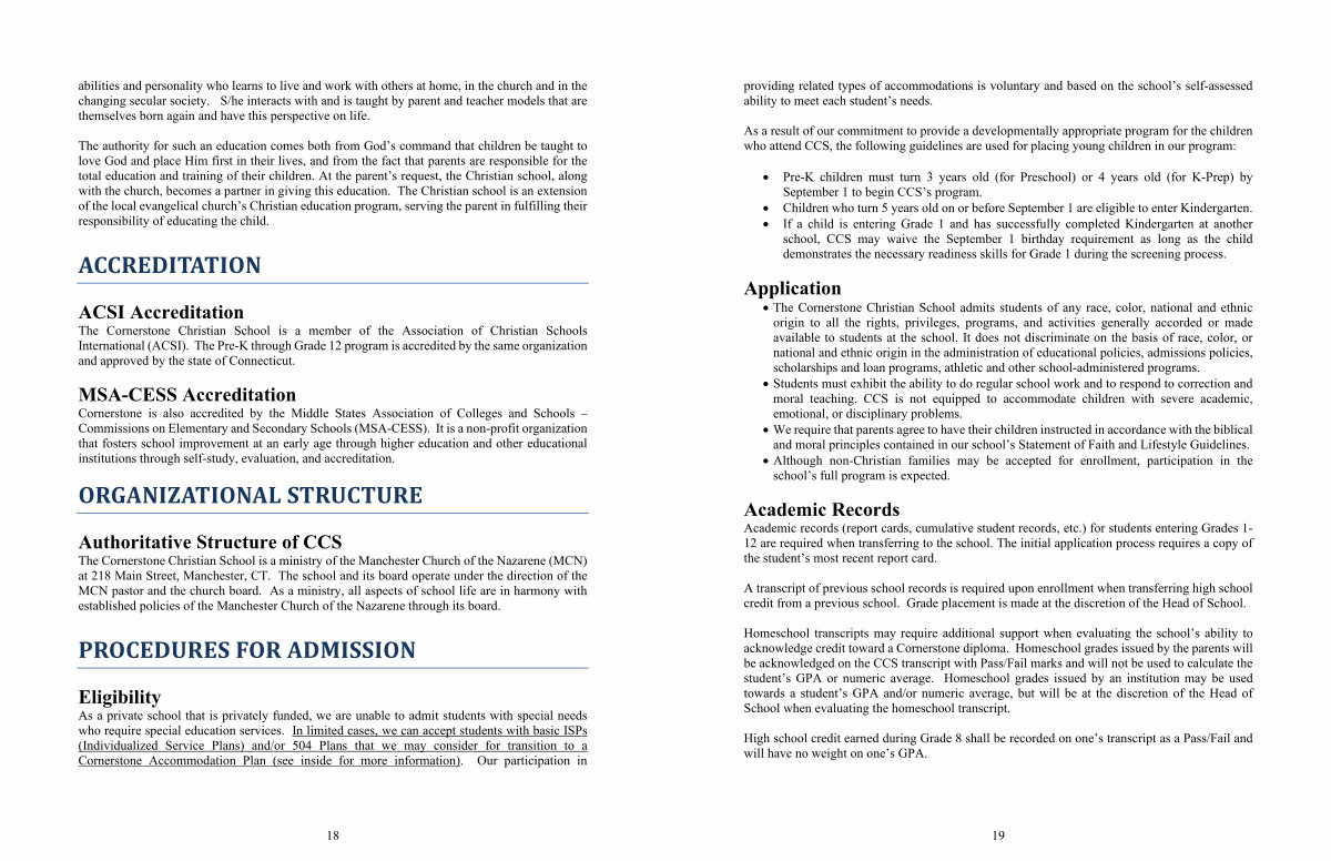 The Cornerstone Christian School is a ministry of the Manchester Church of the Nazarene( MCN) at 218 Main Street, Manchester, CT. The school and its board operate under the direction of the MCN pastor and the church board. As a ministry, all aspects of school life are in harmony with established policies of the Manchester Church of the Nazarene through its board.