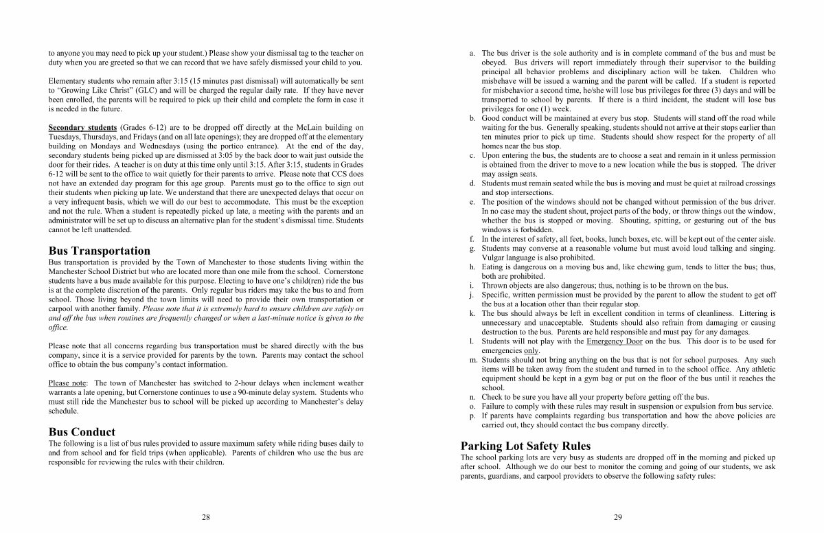 Vulgar language is also prohibited. h. Eating is dangerous on a moving bus and, like chewing gum, tends to litter the bus; thus, both are prohibited. i. Thrown objects are also dangerous; thus, nothing is to be thrown on the bus. j. Specific, written permission must be provided by the parent to allow the student to get off the bus at a location other than their regular stop. k. The bus should always be left in excellent condition in terms of cleanliness. Littering is unnecessary and unacceptable. Students should also refrain from damaging or causing destruction to the bus. Parents are held responsible and must pay for any damages. l. Students will not play with the Emergency Door on the bus. This door is to be used for emergencies only. m. Students should not bring anything on the bus that is not for school purposes. Any such items will be taken away from the student and turned in to the school office. Any athletic equipment should be kept in a gym bag or put on the floor of the bus until it reaches the school. n. Check to be sure you have all your property before getting off the bus. o. Failure to comply with these rules may result in suspension or expulsion from bus service. p. If parents have complaints regarding bus transportation and how the above policies are carried out, they should contact the bus company directly.