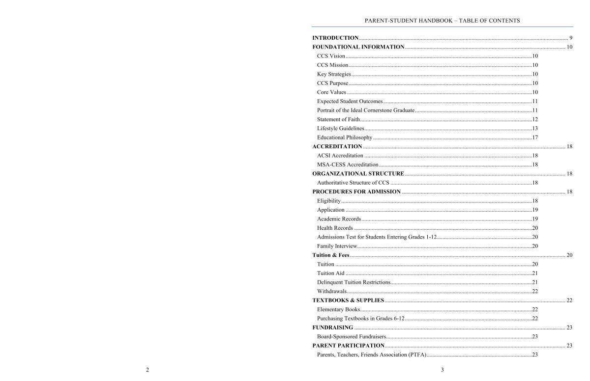 FOUNDATIONAL INFORMATION............................................................................................................... 10 CCS Vision................................................................................................................................. 10 CCS Mission............................................................................................................................... 10 Key Strategies............................................................................................................................. 10 CCS Purpose............................................................................................................................... 10 Core Values................................................................................................................................ 10 Expected Student Outcomes....................................................................................................... 11 Portrait of the Ideal Cornerstone Graduate................................................................................. 11 Statement of Faith....................................................................................................................... 12 Lifestyle Guidelines.................................................................................................................... 13 Educational Philosophy.............................................................................................................. 17