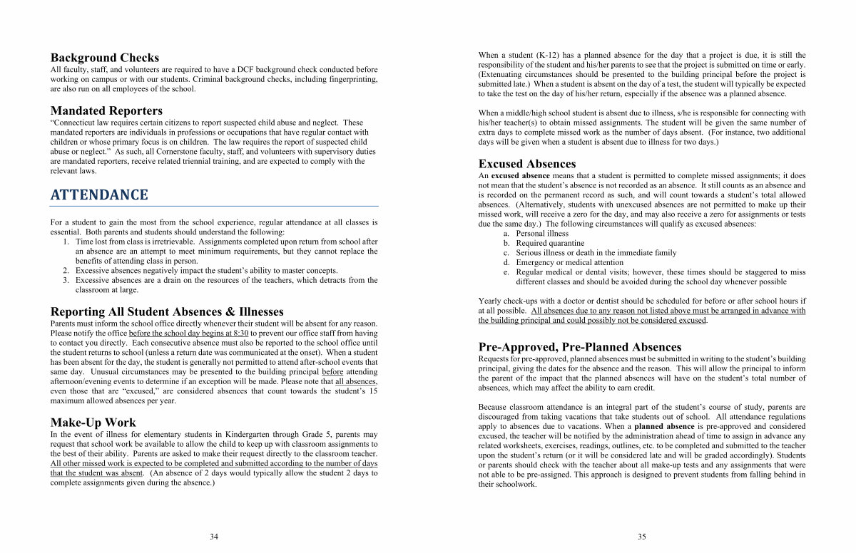 “ Connecticut law requires certain citizens to report suspected child abuse and neglect. These mandated reporters are individuals in professions or occupations that have regular contact with children or whose primary focus is on children. The law requires the report of suspected child abuse or neglect.” As such, all Cornerstone faculty, staff, and volunteers with supervisory duties are mandated reporters, receive related triennial training, and are expected to comply with the relevant laws.