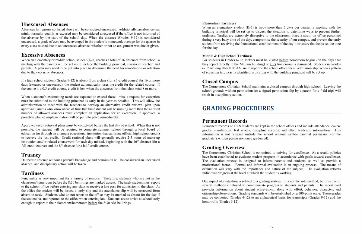 The Cornerstone Christian School maintains a closed campus through high school. Leaving the school grounds without permission( or a signed permission slip by a parent for a field trip) will result in disciplinary action.