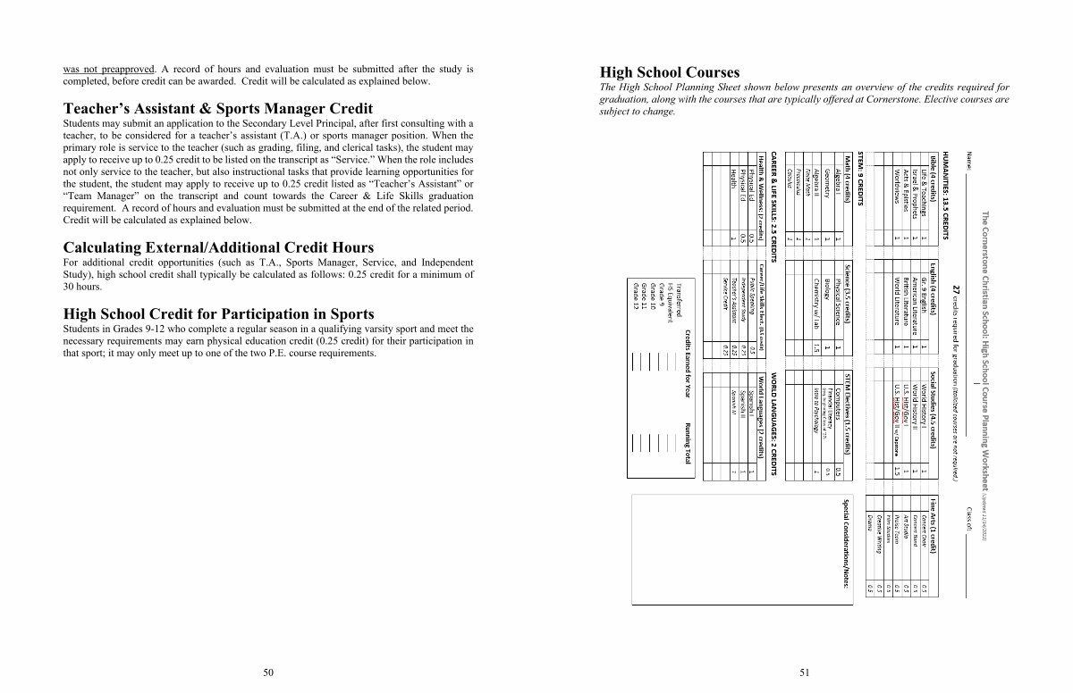 The High School Planning Sheet shown below presents an overview of the credits required for graduation, along with the courses that are typically offered at Cornerstone. Elective courses are subject to change.