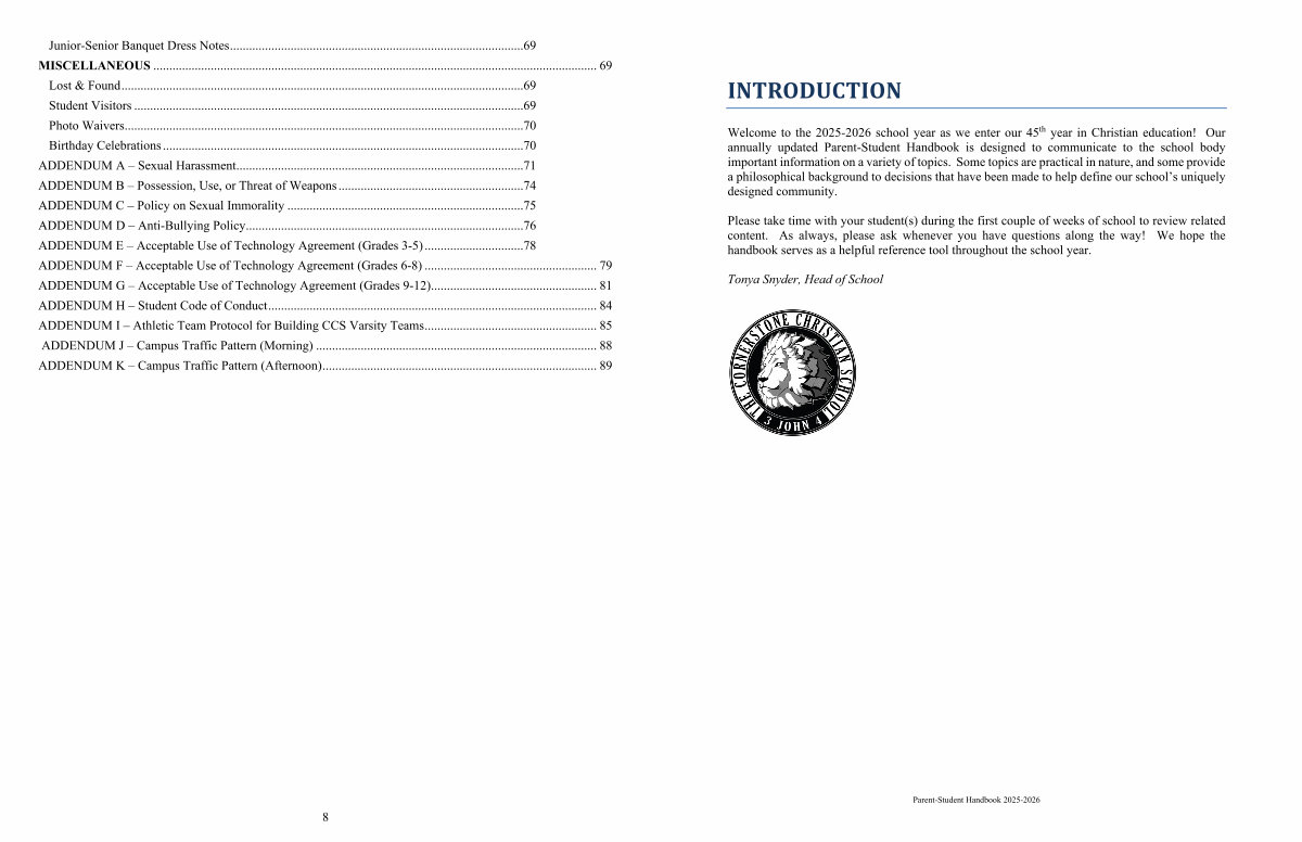 MISCELLANEOUS........................................................................................................................................... 69 Lost & Found.............................................................................................................................. 69 Student Visitors.......................................................................................................................... 69 Photo Waivers............................................................................................................................. 70 Birthday Celebrations................................................................................................................. 70 ADDENDUM A – Sexual Harassment.......................................................................................... 71 ADDENDUM B – Possession, Use, or Threat of Weapons.......................................................... 74 ADDENDUM C – Policy on Sexual Immorality.......................................................................... 75 ADDENDUM D – Anti-Bullying Policy....................................................................................... 76 ADDENDUM E – Acceptable Use of Technology Agreement( Grades 3-5)............................... 78 ADDENDUM F – Acceptable Use of Technology Agreement( Grades 6-8)...................................................... 79 ADDENDUM G – Acceptable Use of Technology Agreement( Grades 9-12).................................................... 81 ADDENDUM H – Student Code of Conduct....................................................................................................... 84 ADDENDUM I – Athletic Team Protocol for Building CCS Varsity Teams...................................................... 85 ADDENDUM J – Campus Traffic Pattern( Morning)........................................................................................ 88 ADDENDUM K – Campus Traffic Pattern( Afternoon)...................................................................................... 89