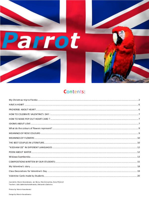 My Christmas trip to Florida............................................................................................................................................................... 2 HAVE A HEART.................................................................................................................................................................................... 6 PROVERBS ABOUT HEART.................................................................................................................................................................. 6 HOW TO CELEBRATE VALENTINE ' S DAY:........................................................................................................................................... 7 HOW TO MAKE POP-OUT HEART CARD?........................................................................................................................................... 7 IDIOMS ABOUT LOVE.......................................................................................................................................................................... 7 What do the colours of flowers represent?........................................................................................................................................ 9 MEANINGS OF ROSE COLOURS........................................................................................................................................................... 9 MEANINGS OF FLOWERS.................................................................................................................................................................. 10 THE BEST COUPLES IN LITERATURE................................................................................................................................................... 10 " KOCHAM CIE " IN DIFFERENT LANGUAGES...................................................................................................................................... 12 POEM ABOUT WATER....................................................................................................................................................................... 12 Wislawa Szymborska......................................................................................................................................................................... 13 COMPOSITIONS WRITTEN BY OUR STUDENTS:................................................................................................................................. 15 My Valentine’ s story......................................................................................................................................................................... 18 Class Decorations for Valentine’ s Day.............................................................................................................................................. 19 Valentine Cards made by Students................................................................................................................................................... 20