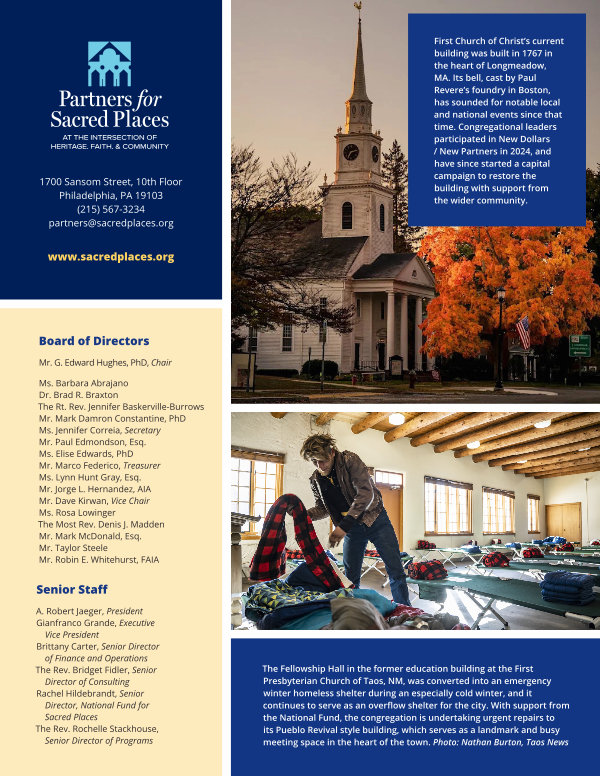 First Church of Christ’ s current building was built in 1767 in the heart of Longmeadow, MA. Its bell, cast by Paul Revere’ s foundry in Boston, has sounded for notable local and national events since that time. Congregational leaders participated in New Dollars / New Partners in 2024, and have since started a capital campaign to restore the building with support from the wider community. www. sacredplaces. org
