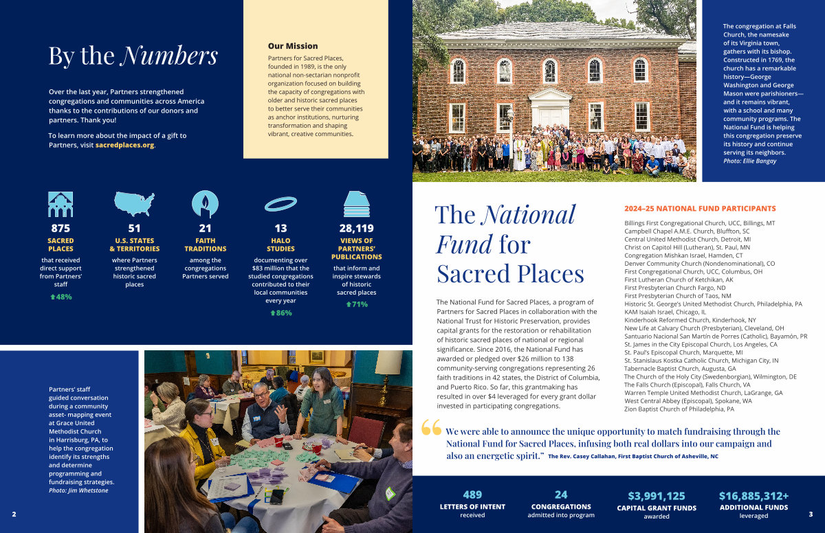 The National Fund for Sacred Places, a program of Partners for Sacred Places in collaboration with the National Trust for Historic Preservation, provides capital grants for the restoration or rehabilitation of historic sacred places of national or regional significance. Since 2016, the National Fund has awarded or pledged over $ 26 million to 138 community-serving congregations representing 26 faith traditions in 42 states, the District of Columbia, and Puerto Rico. So far, this grantmaking has resulted in over $ 4 leveraged for every grant dollar invested in participating congregations.