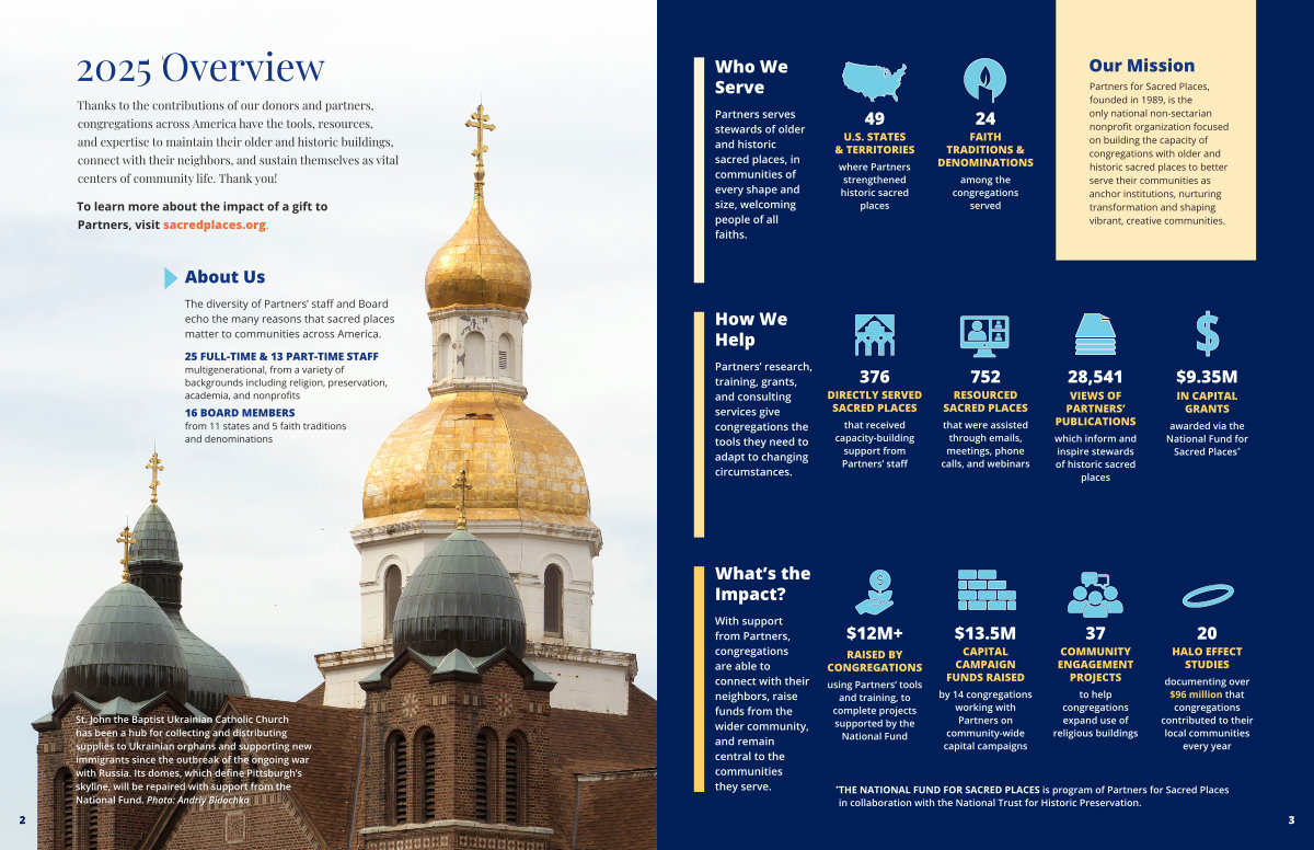 Partners for Sacred Places, founded in 1989, is the only national non-sectarian nonprofit organization focused on building the capacity of congregations with older and historic sacred places to better serve their communities as anchor institutions, nurturing transformation and shaping vibrant, creative communities.