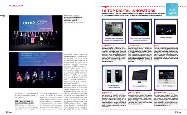 La categoria “ Green ” riconosce le innovazioni verso una mobilità più sostenibile e neutrale dal punto di vista climatico e comprende le sottocategorie “ Elettrificazione e propulsori alternativi ” ( tecnologie della batteria , BMS , carburanti rinnovabili e sistemi a celle a combustibile , motori elettrici , elettronica di potenza , ricarica EV , estensori di gamme , stoccaggio di carburante di bordo ...); “ Servizi sostenibili ” ( sviluppi di batterie , servizi per il riciclo ...); prodotti sostenibili ( materiali , circolarità , LCA , ecodesign , packaging alleggeriti ...). Premiate in questa categoria , troviamo le aziende : Autocrypt con la Cyber Security Testing Platform CSTP ; Continental Automotive Technologies con Smart Cockpit , sistema di bordo preconfigurato che combina funzioni di cluster , infotainment e assistenza alla guida ; Forvia Hella con il modulo di distribuzione intelligente di energia IPDM con fusibile elettronico integrato eFuse ; Marelli con il microLed h-Digi ; Aurora Labs con Line-of-Code Intelligence LOCI ; C2A Security con EVSEC ,