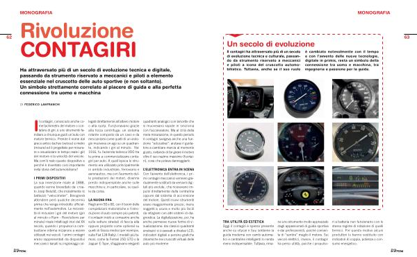 LA NUOVA ERA Negli anni 50 e 60, con il boom delle competizioni motoristiche e l’ introduzione di auto sempre più potenti, il contagiri iniziò a comparire anche sulle vetture stradali di fascia alta oppure proposto come optional su quelli di fascia media( per esempio, sulla Fiat 128 Rally). I modelli più famosi, come la Ferrari 250 GTO o la Jaguar E-Type, sfoggiavano eleganti quadranti analogici con lancette che si muovevano rapide in sincronia con l’ acceleratore. Ma al di là della mera misurazione, in questo periodo il contagiri svolgeva anche una funzione“ educativa”: aiutava il guidatore a cambiare marcia al momento giusto, evitando di far girare il motore oltre il suo regime massimo( fuorigiri), cosa che poteva danneggiarlo.