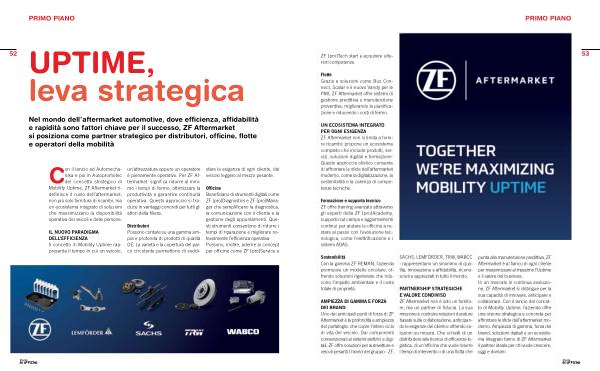 PARTNERSHIP STRATEGICHE E VALORE CONDIVISO ZF Aftermarket non è solo un fornitore, ma un partner di fiducia. La sua missione è costruire relazioni durature basate sulla collaborazione, anticipando le esigenze dei clienti e offrendo soluzioni su misura. Che si tratti di un distributore alla ricerca di efficienza logistica, di un’ officina che vuole ridurre i tempi di intervento o di una flotta che punta alla manutenzione predittiva, ZF Aftermarket è al fianco di ogni cliente per massimizzare al massimo l’ Uptime e il valore del business. In un mercato in continua evoluzione, ZF Aftermarket si distingue per la sua capacità di innovare, anticipare e collaborare. Con il lancio del concetto di Mobility Uptime, l’ azienda offre una visione strategica e concreta per affrontare le sfide dell’ aftermarket moderno. Ampiezza di gamma, forza dei brand, soluzioni digitali e un ecosistema integrato fanno di ZF Aftermarket il partner ideale per chi vuole crescere, oggi e domani.