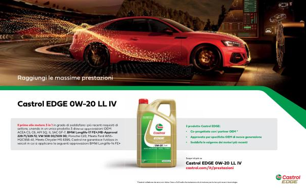 Il primo olio motore 3 in 1 in grado di soddisfare i più recenti requisiti di settore, unendo in un unico prodotto 3 diverse approvazioni OEM: ACEA C5; C6; API SQ; IL SAC GF-7; BMW Longlife-17 FE +; MB-Approval 229.71 / 229.72; VW 508 00 / 509 00; Porsche C20; Meets Ford WSS- M2C956-A1; Meets Chrysler MS 6395; Castrol ne garantisce l’ utilizzo in veicoli in cui si applicano le seguenti approvazioni BMW Longlife-14 FE +