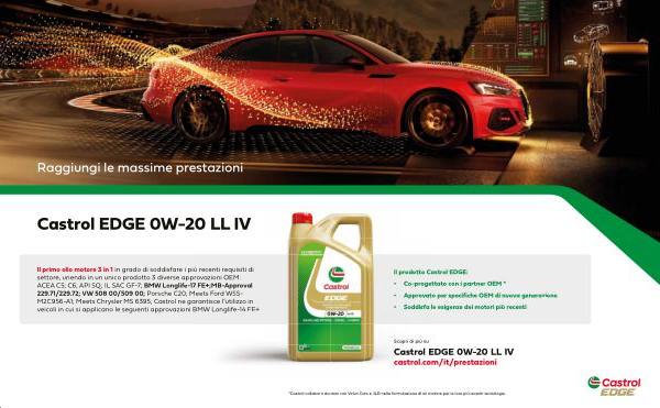 Il primo olio motore 3 in 1 in grado di soddisfare i più recenti requisiti di settore, unendo in un unico prodotto 3 diverse approvazioni OEM: ACEA C5; C6; API SQ; IL SAC GF-7; BMW Longlife-17 FE +; MB-Approval 229.71 / 229.72; VW 508 00 / 509 00; Porsche C20; Meets Ford WSS- M2C956-A1; Meets Chrysler MS 6395; Castrol ne garantisce l’ utilizzo in veicoli in cui si applicano le seguenti approvazioni BMW Longlife-14 FE +
