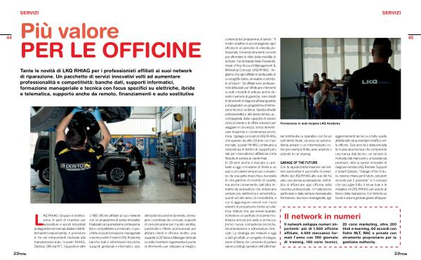 1.900 officine affiliate ai suoi network con un programma di servizi innovativi, finalizzato ad aumentarne professionalità e competitività sul mercato. Il pacchetto include formazione manageriale e tecnica sotto il brand LKQ Academy, banche dati e informazioni tecniche, supporti gestionali e informatici, assistenza tecnica anche da remoto, immagine coordinata dei concept, supporti di comunicazione per il punto vendita, pubblicità e offerte promozionali per attrarre clienti in officina. Inoltre, una squadra di 20 Service Manager dedicati su tutto il territorio rappresenta il punto di riferimento per utilizzare al meglio i